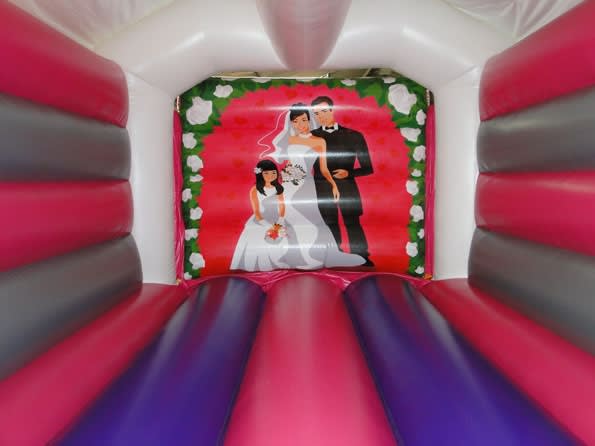 Our 14 x 19 Adult Themed Wedding Bouncy Castle, designed by ourselves with your wedding in mind, using the most popular colours chosen for weddings, and built by one off the best manufacturers in England, ensuring that this castle and artwork will look the part on your big day. This unit is built more robust with higher walls and deeper bouncing area making it suitable for adults as well as children. Our normal delivery areas are Dewsbury, Wakefield, Mirfield, Normanton and Pontefract areas, but we may be able to delivery further afield subject to delivery costs. Please note a non-returnable booking fee of £50 is required before the booking will be confirmed by us with confirmation via e-mail. ( this fee will be deducted from the original booking price ).This booking fee will only be refunding if the castle has to be cancelled due to bad weather and is deemed unsafe to be set up.