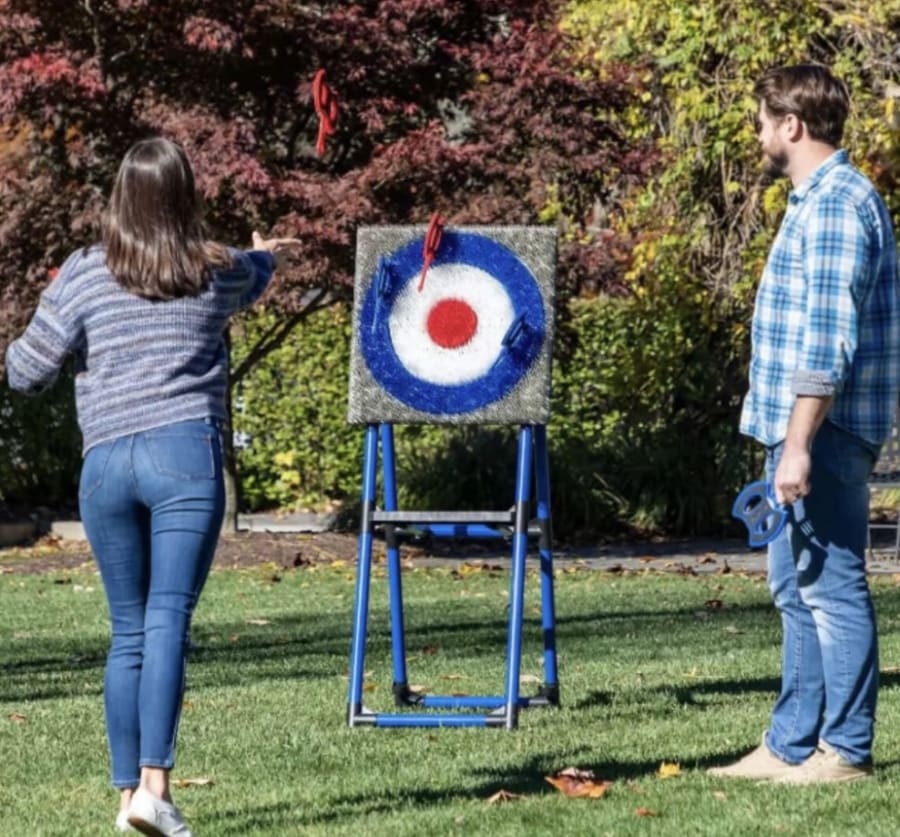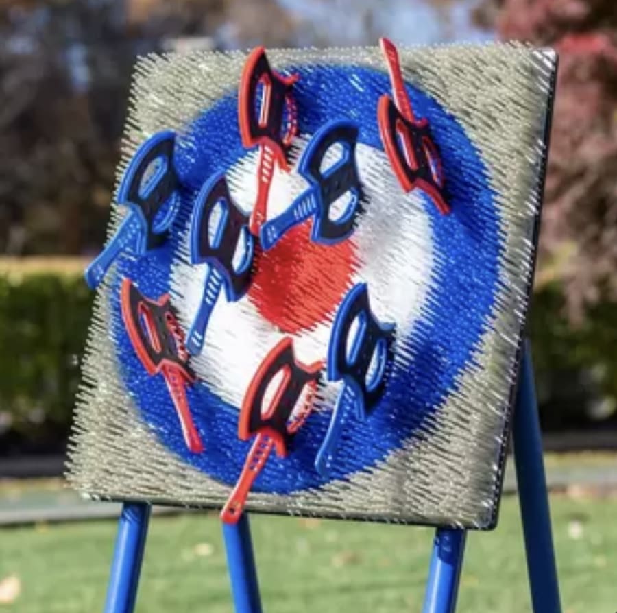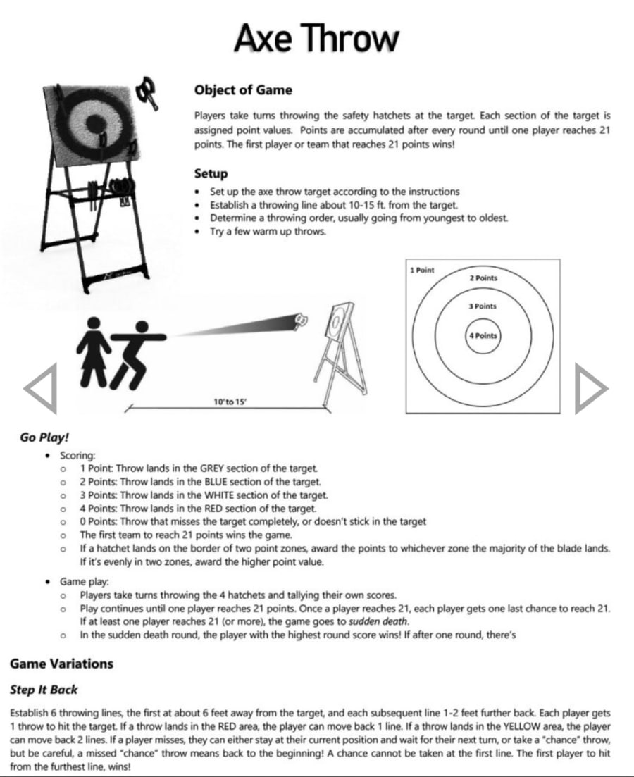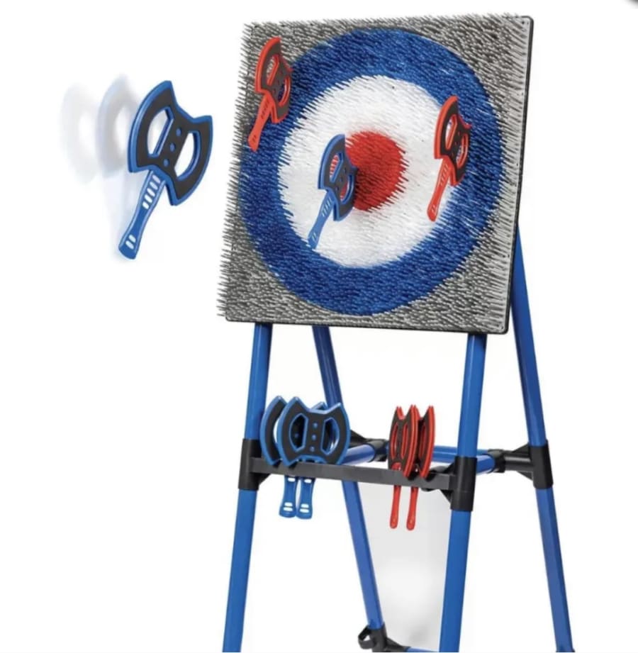 Adult supervision is required at all times. The game needs a minimum area of 8ft width and should be set up against a secure backdrop so no one can walk behind the target while in use. We recommend a clear throwing lane of 10–15ft for best play. Safety axes are designed for beginners and kids, but common-sense rules still apply.