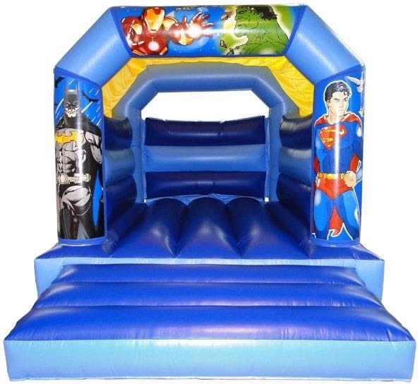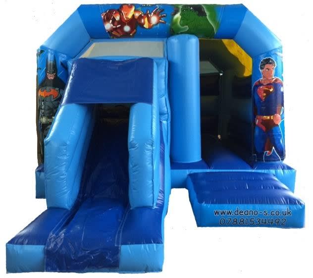 Our new 11 x 15 super heroes bouncy castle is a hit with all the super heroes fans, and as a roof height of only 9 foot 3 inches in height, suitable for both indoor and outdoor hire. for ages up to 12 and will take 6 - 7 children depending on size and weight, also available has a 12 x 18 Bounce and Slide