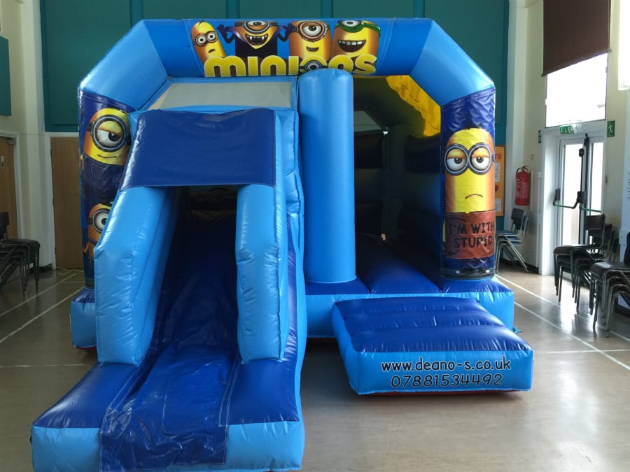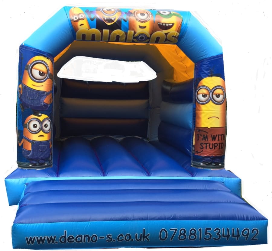 This 11 x 15 Velcro Minions bouncy castle from Deano's bouncy castle hire covering Wakefield, Dewsbury, Castleford and surrounding areas, it is bound to be a big hit with all the minions fans out there, we also have it in a 12 x18 Bouncy and Slide Castle. It has a roof height of only 9 foot 3 so should fit in most indoor venues. It also has a rain cover to protect from light rain. When you book online the castle you have chosen will be taken off hire on your chosen date and a confirmation e-mail with an order number will be sent to you instantly on completion if you need and further information do hesitate to contact us on 07881534492.