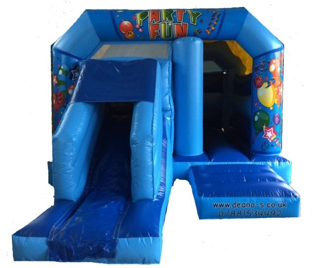 Our new party fun bounce and slide featuring party balloons and streamers,low roofed castle gives you the benefit of having a bouncy castle and a slide all in one, it is ideal for boys and girls alike.